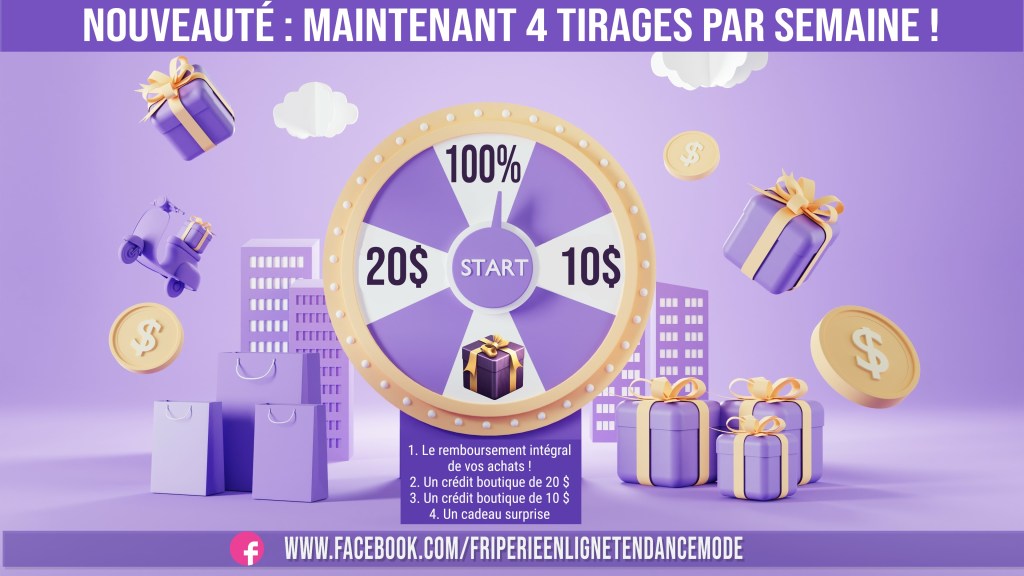 *Veuillez noter que pour participer et être éligible à tous les tirages promotionnels offerts par Friperie En Ligne Tendance Mode, vos achats doivent être réglés en totalité avant 19 h 00 le jour de chaque tirage du vendredi.